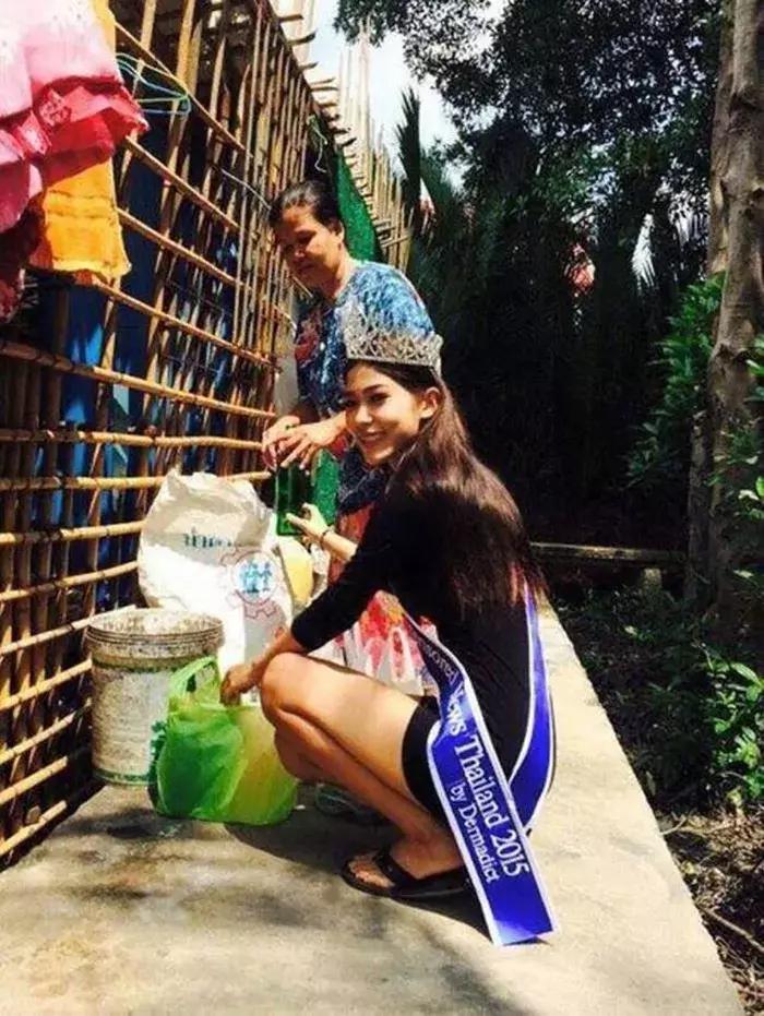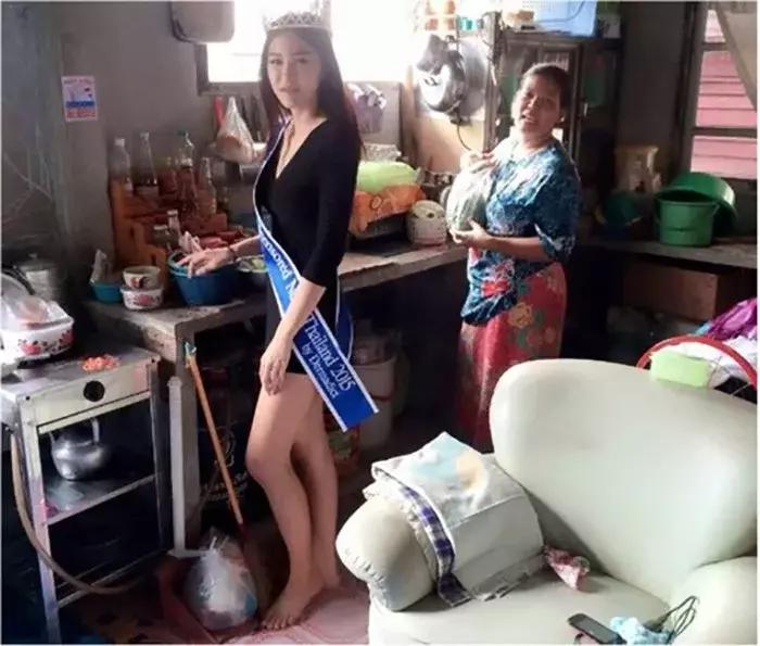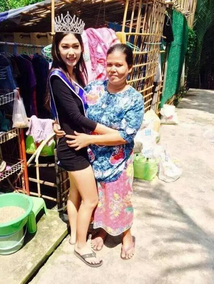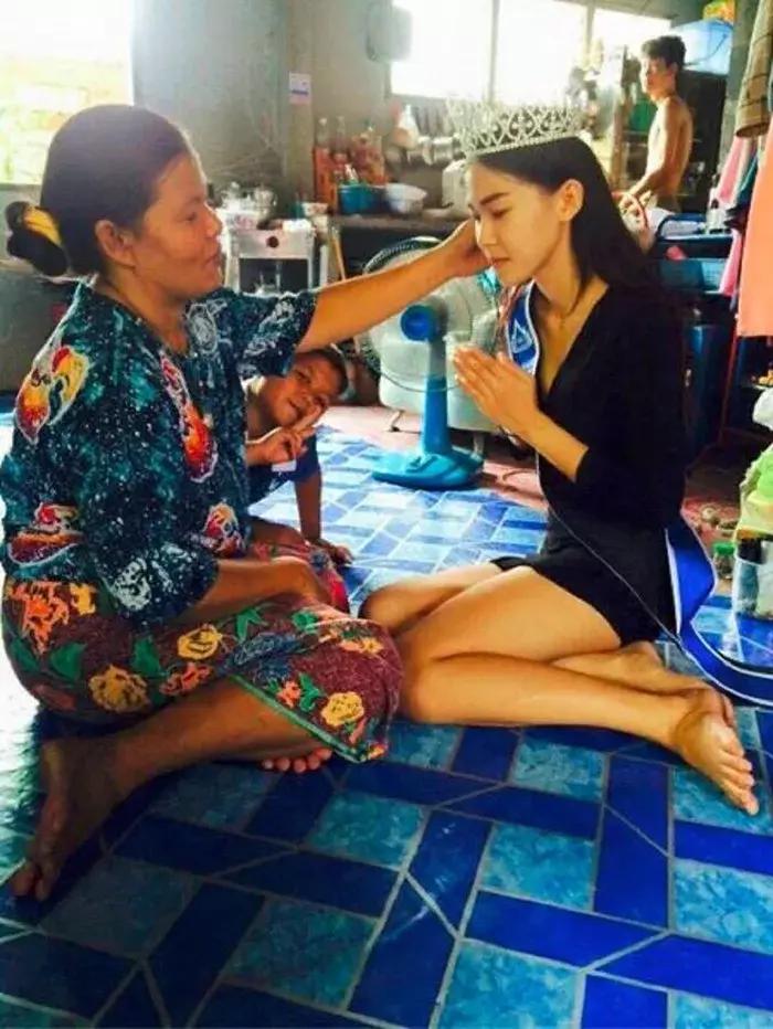 Тайская королева красоты стала на колени перед матерью, работающей дворником