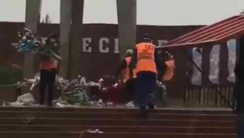 На кадрах видно, как рабочие во время дождя убирают цветы, возложенные к Вечному огню.