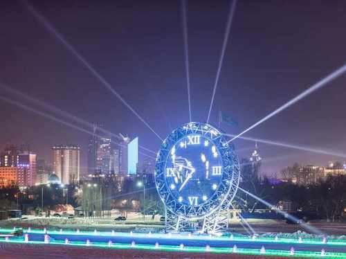 Часы оснащены точным механизмом и в новогоднюю ночь фейерверк с набережной реки Есиль будет запущен точно в то время, когда стрелки покажут полночь. Прямо под часами для горожан обустроен каток.