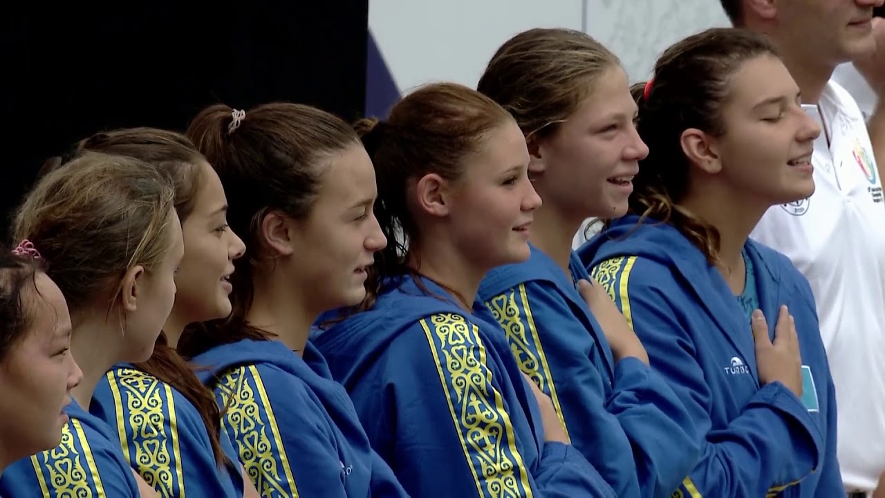 В первой игре женской казахстанской ватерпольной команде противостояла сборная Китая. Матч традиционно начался с гимнов стран-соперниц. Но звучание гимна Республики Казахстан внезапно прервалось на 8-й секунде из-за технической неполадки звуковой аппаратуры. Это нисколько не смутило команду, которая дружно продолжила исполнение гимна «а капелла» до конца, чем вызвала искренний восторг и аплодисменты зрителей и участников соревнования.