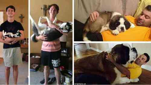 Любящие хозяева поделились фотографиями своих питомцев «до и после», где на первом фото — совсем еще щенки, а на втором — уже подросшие собаки.