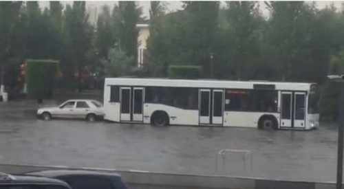 Жителям Астаны День столицы запомнился не только праздничными мероприятиями, но и проливным дождем с градом, в результате которого затопило несколько улиц. Так, несколько жителей столицы засняли на свои мобильные телефоны забавную картину — легковой автомобиль буксировал автобус по затопленной улице, сообщает корреспондент Tengrinews.kz.