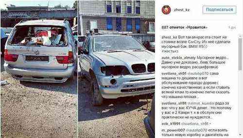 В Алматы на парковке у магазина «CarCity» элитный внедорожник BMW Х5 в аварийном состоянии превратили в мусорный бак.