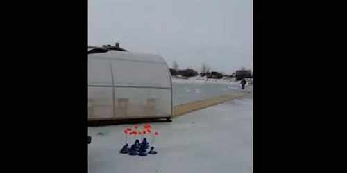 Самих рыболовов на видео нет, зато снят активный процесс подготовки к их приезду. Причем работники на ковер не наступают, а идут по льду.