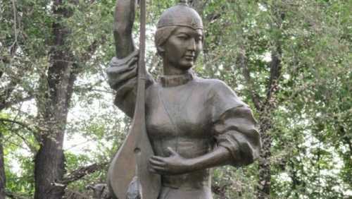 К слову, данный памятник в Талдыкоргане был установлен еще в 1993 году. Скульптура прославленной женщины на большом булыжнике восседает с домброй, к ней льнут белка, птица и лань. Автором творения является – скульптор Т.Досмагамбетов.
