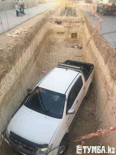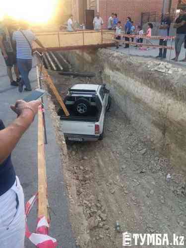 Необычное ДТП произошло в Актау. Автомобиль Toyota оказался в траншее, вырытой для прокладки инженерных коммуникаций, сообщает Тумба.kz.