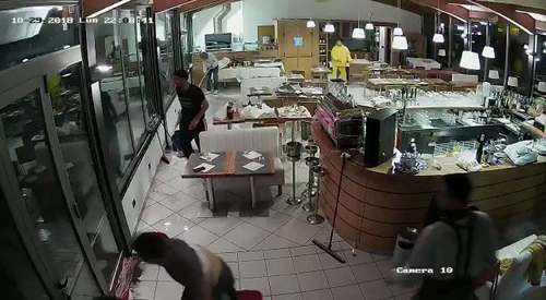 Камера наблюдения курортного ресторана в городе Аренцано, который находится в 20 км от Генуи, зафиксировала, как мощная волна разбивает стекло и врывается внутрь помещения устрашающим потоком. Сотрудники заведения беспомощно мечутся в попытках укрепить окна и двери, но терпят поражение. Одного из них сносит потоком, другой успевает выскочить на барную стойку.
